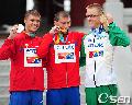 [OSEN=대구, 민경훈 기자] 3일 오전 대구 국채보상운동공원에서 열린 '2011 대구 세계육상선수권대회' 남자 50km 경보 경기를 마치고 은메달-데니스 니체고로도브(러시아), 금메달-세르게이 바쿠린(러시아), 동메달 자레드 탤런트(호주)(왼쪽부터)가 시상대 위에서 포토타임을 갖고 있다./ rumi@@osen.co.kr